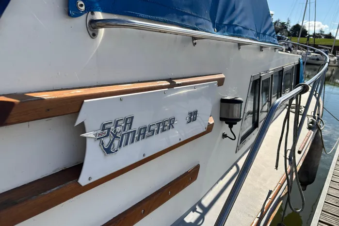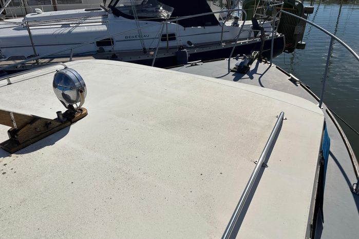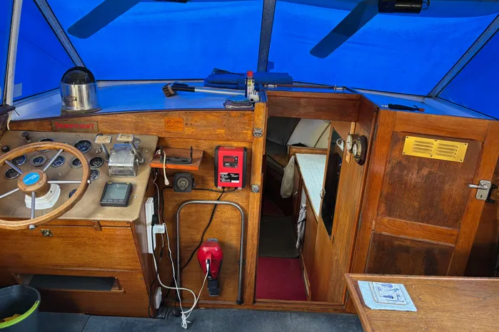 Built circa 1975 by Seamaster Boats Limited to their own design. White semi-displacement GRP hull and superstructure. Blue style band. Grey painted decks. Wooden rubbing strake. Interior joinery of teak and teak faced ply. Wheel steering. Hull sandblasted to remove old antifouling in 2020 and deck and brightwork professionally stripped and made good in 2022 by Tidemill Yacht Harbour.