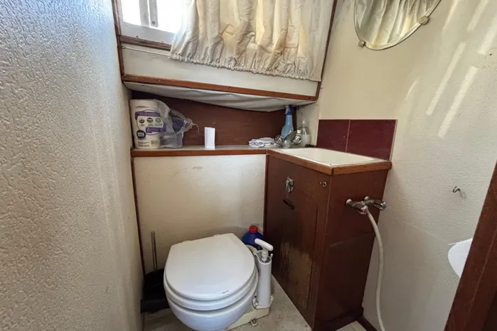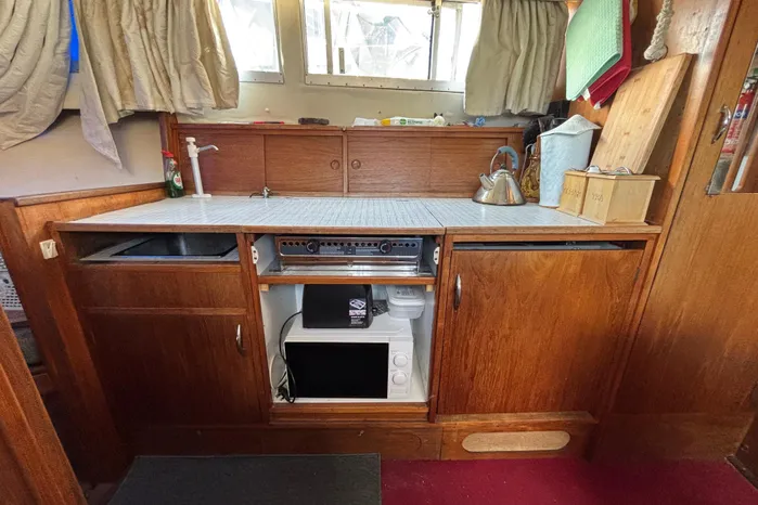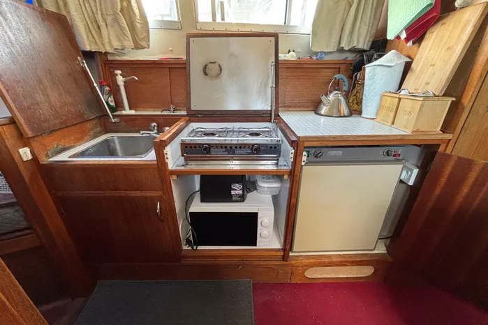 Wheelhouse to centre cockpit with helm to port and folding pilot seat, full instrumentation and controls. Bench seats aft to port and starboard with lockers beneath. Steps down to saloon with dinette to port, converting to a double berth, with storage behind and below. Heads compartment to starboard with manual sea toilet, sink with hot and cold mixer tap and shower with shower tray. Linear galley to starboard side with stainless steel sink with hot and cold pumped water supply, generous stowage above and below, two burner spirit hob, microwave and 12V/230V refrigerator. open plan cabin to forepeak with 2 vee berths with infill converting to a double if required. Curtains.