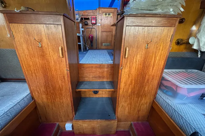 Aft cabin with wide single berths to port and starboard. 2 x Hanging lockers port and starboard. Dressing table with vanity sink with hot and cold mixer tap, drawers beneath. Steps up to wheelhouse.