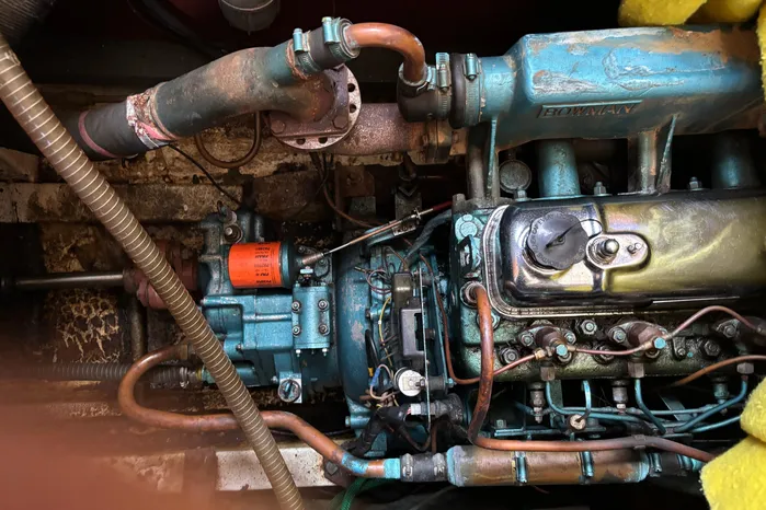 Located under the cockpit sole. Twin Thornycroft BMC 60hp diesel engines on shafts to fixed 3 blade propellers. Electric start. Single lever controls. 2 x 182l Fuel tanks