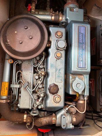 Located beneath the cockpit sole, Perkins Sabre M65 diesel inboard engine (2001) Serviced in 2022. Shaft drive to feathering two blade propeller. Single lever engine control. Electric start. Cruising speed approx. 6 knots. Maximum speed approx. 7 knots. Fuel tank capacity 75 gallons.