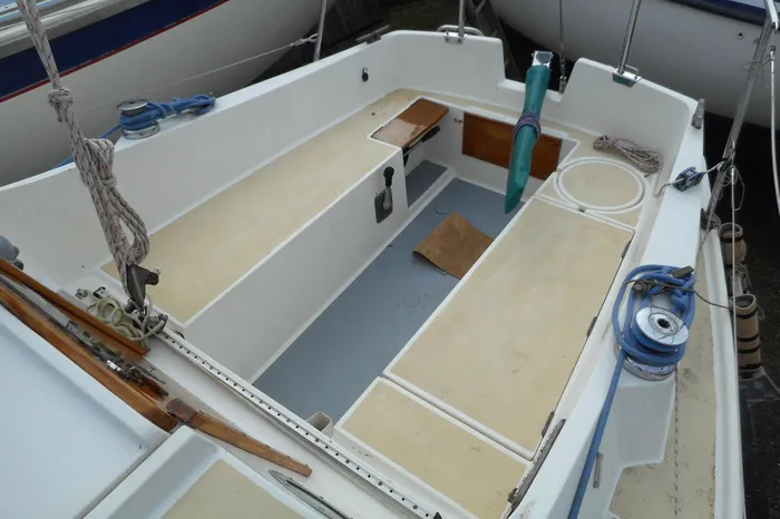 Built by Seamaster Ltd in 1978 to a design by Holman & Pye. White GRP hull and superstructure with moulded in and cream painted non-slip to decks. Cast iron fin keel. Tiller steering to transom hung rudder. Self draining cockpit (new cockpit drain skin fitting/seacock 2025) with seating and stowage under. Self draining anchor well and gas locker. Alloy rubbing strake with rubber inserts.