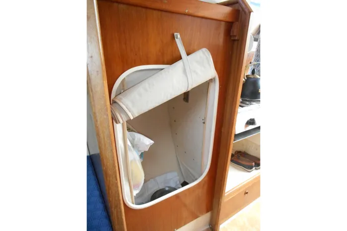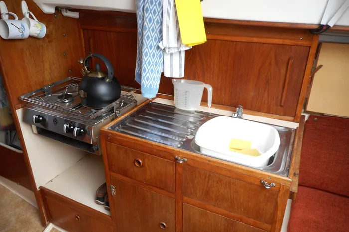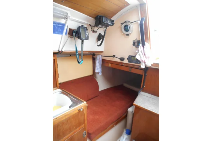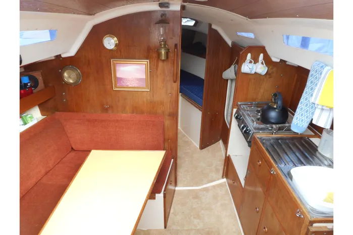 The accommodation offers up to five berths in two cabins with approx 5' 10'' headroom. Forward cabin with V berths and infill converting to a double berth with stowage above and below. Opening hatch to foredeck. Door to port to heads compartment, with Albin Marine sea toilet (2022). Stowage. Deck vent. Hanging locker opposite to starboard with zipped front closure. Main saloon with U shaped dinette to port with table converting to a double berth. Stowage under and outboard. Galley opposite to starboard with two burner cooker with grill (2022). Stainless steel sink with pressurised cold water supply (water tank, pump and tap 2022). Stowage above and below. Quarter berth aft to starboard with chart table over. Steps up to self draining cockpit with seating and stowage under. Full interior lighting.