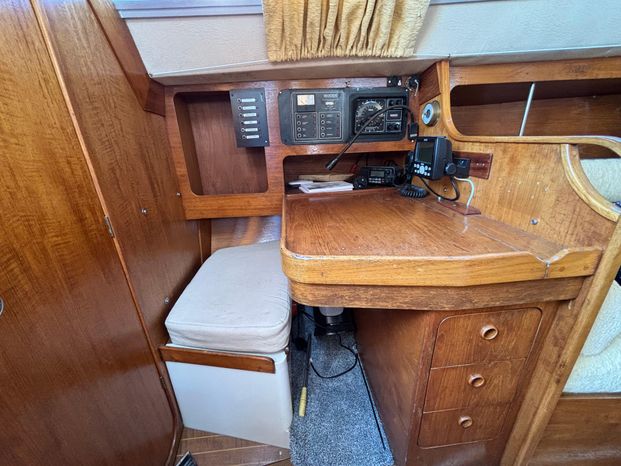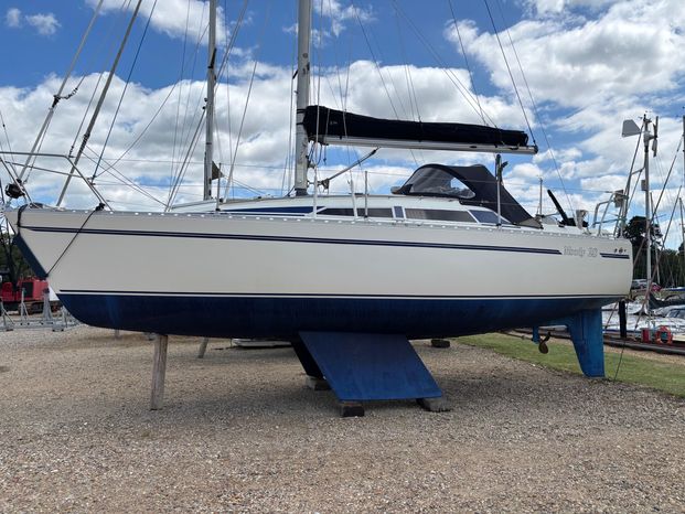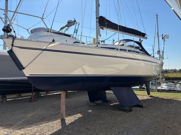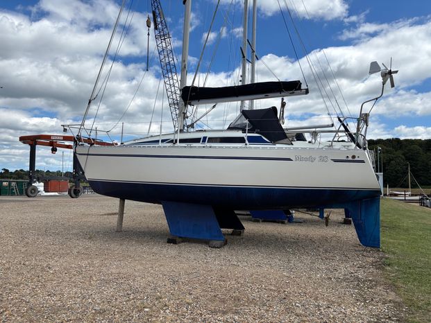 Built in 1987 by Marine Projects of Plymouth to a design by Bill Dixon. White GRP hull with aluminium toe rail. White GRP superstructure with moulded non slip to decks. Cast iron bilge keels. Tiller steering to skeg hung rudder. Aft self draining cockpit. Self draining anchor locker. Sea cocks replaced Dec 2023. Windows and hatches replaced late 2023. Antifouled and anodes 2025.