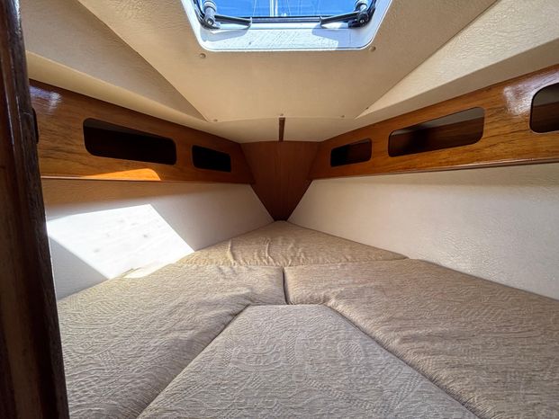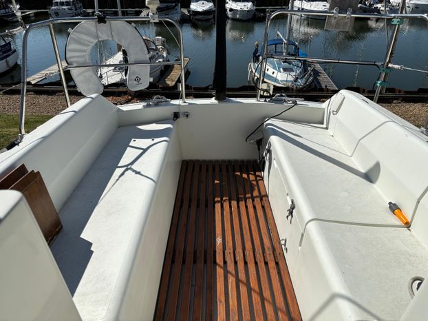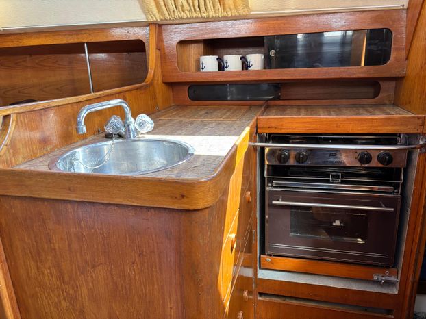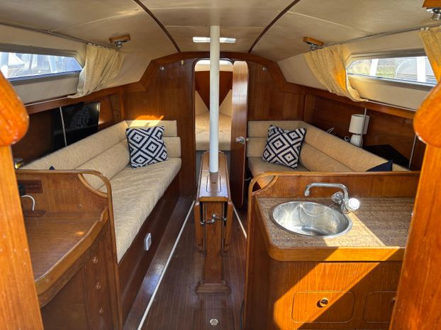 V berth to forward cabin with infill creating a double berth with storage above and below. Escape hatch to foredeck. Saloon with settee berths to port and starboard side with storage above and below and drop leaf table with bottle stowage to centre. Navigation area and chart table to port. Galley to starboard side, stainless steel sink with hot and cold pressurised mixer tap, Plastimo Neptune 2000 gimbled two burner gas cooker with oven and grill, large top loading cool box and plenty of storage. Heads to port with Jabsco marine toilet (2023) and washbasin with hot and cold mixer tap/pull out shower and hatch. Aft cabin with double berth, opening portlight to transom and storage locker. Teak and holly cabin floor, curtains. LED interior lighting. Upholstery replaced 2023. Webasto diesel fired warm air heating (new 2023)