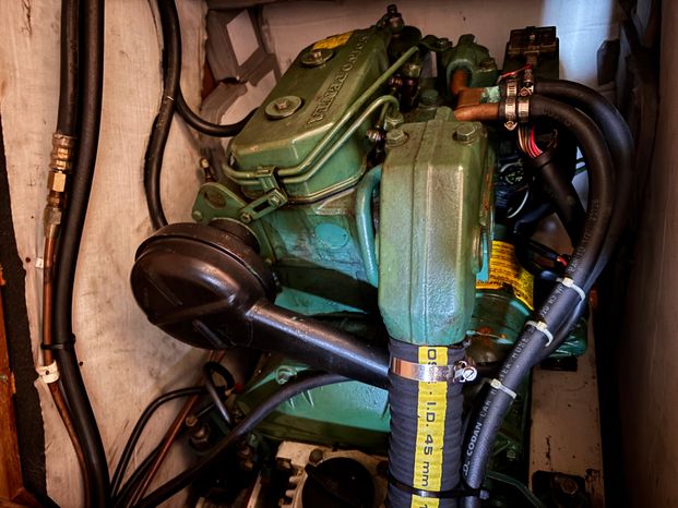 Located abaft the companionway. Volvo Penta 2002 18hp diesel engine. Electric start. Shaft drive to fixed two blade propeller. Raw water cooled. Single lever engine control. Cruising speed 6 knots. Maximum speed 7 knots. Rope cutter. Webasto heating fitted 2023. Propeller, shaft, coupling, rope cutter and stern gland all replaced November 2023. Full engine service 2025.