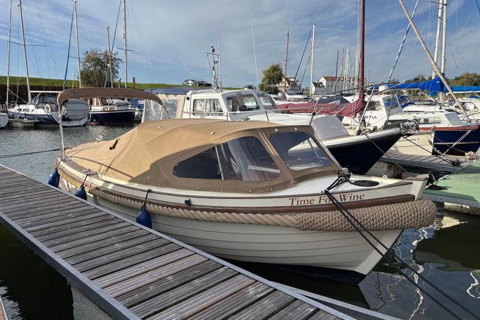Interboat 750 built in 2010 by Interboat of Holland. Cream GRP clinker style hull with hardwood rubbing strake / cockpit coamings and traditional rope fendering. Wheel steering to skeg hung rudder. Antifouled Spring 2025.